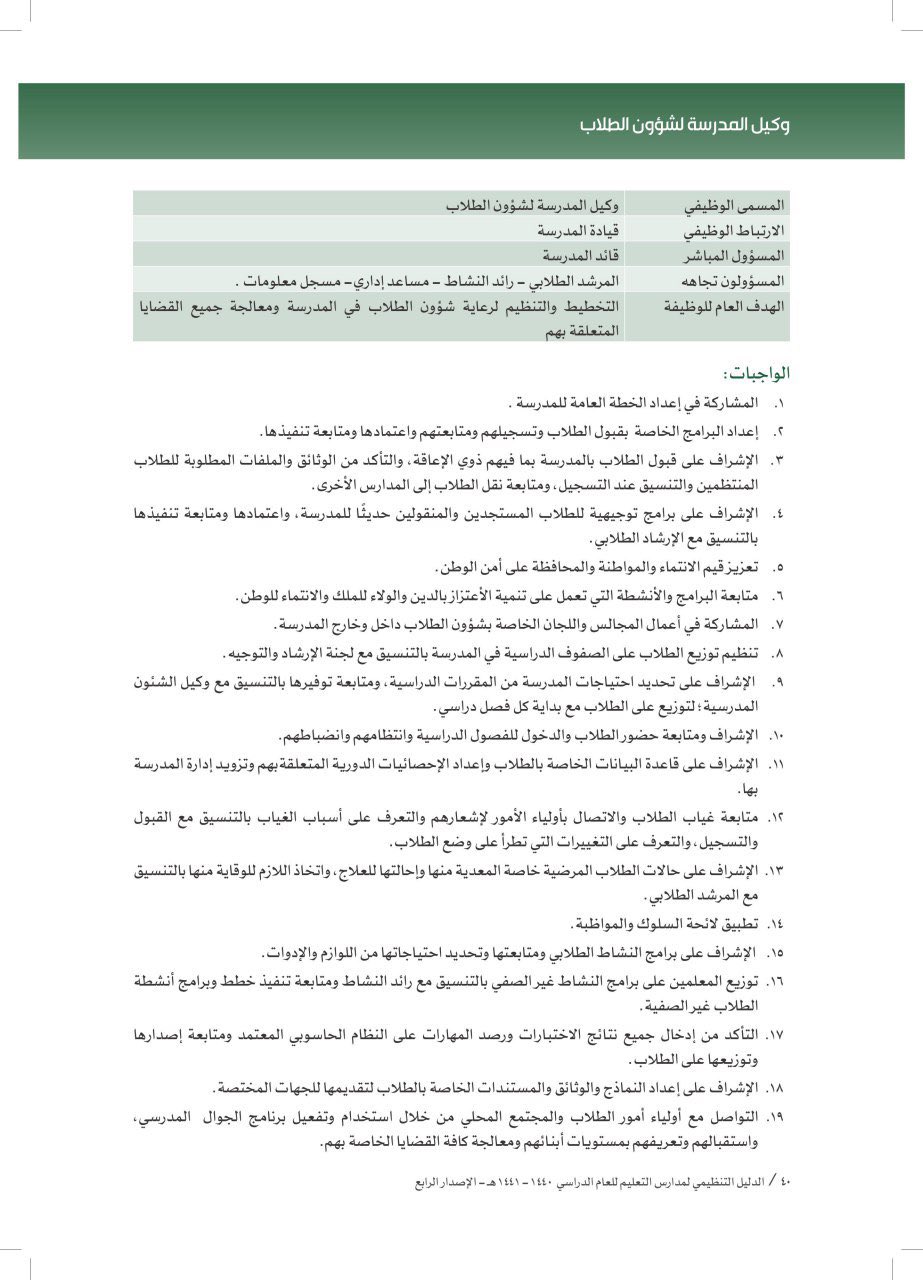 تعريف ي عي ن معلومات موثوقة وفق نموذج تنظيمي عما تتضمنه الوظيفة. السلام عليكم ورحمة الله وبركاته بالمرفقات تجدون المهام التنظيمية للجهات العاملة في المدرسة التوصيف الوظيفي للتشكيلات المدرسيه. شكرا لكم على المدونة المتميزة وأعتقد أن هناك خطأ في الدليل الإجرائي صفحة 30 جميع مهام وكيل الشؤون التعليمية مسندة إلى وكيل الشؤون المدرسية. 4 تجهيز جدول المواعيد المخصص بالملاحظة اليومية للاختبارات المدرسية.