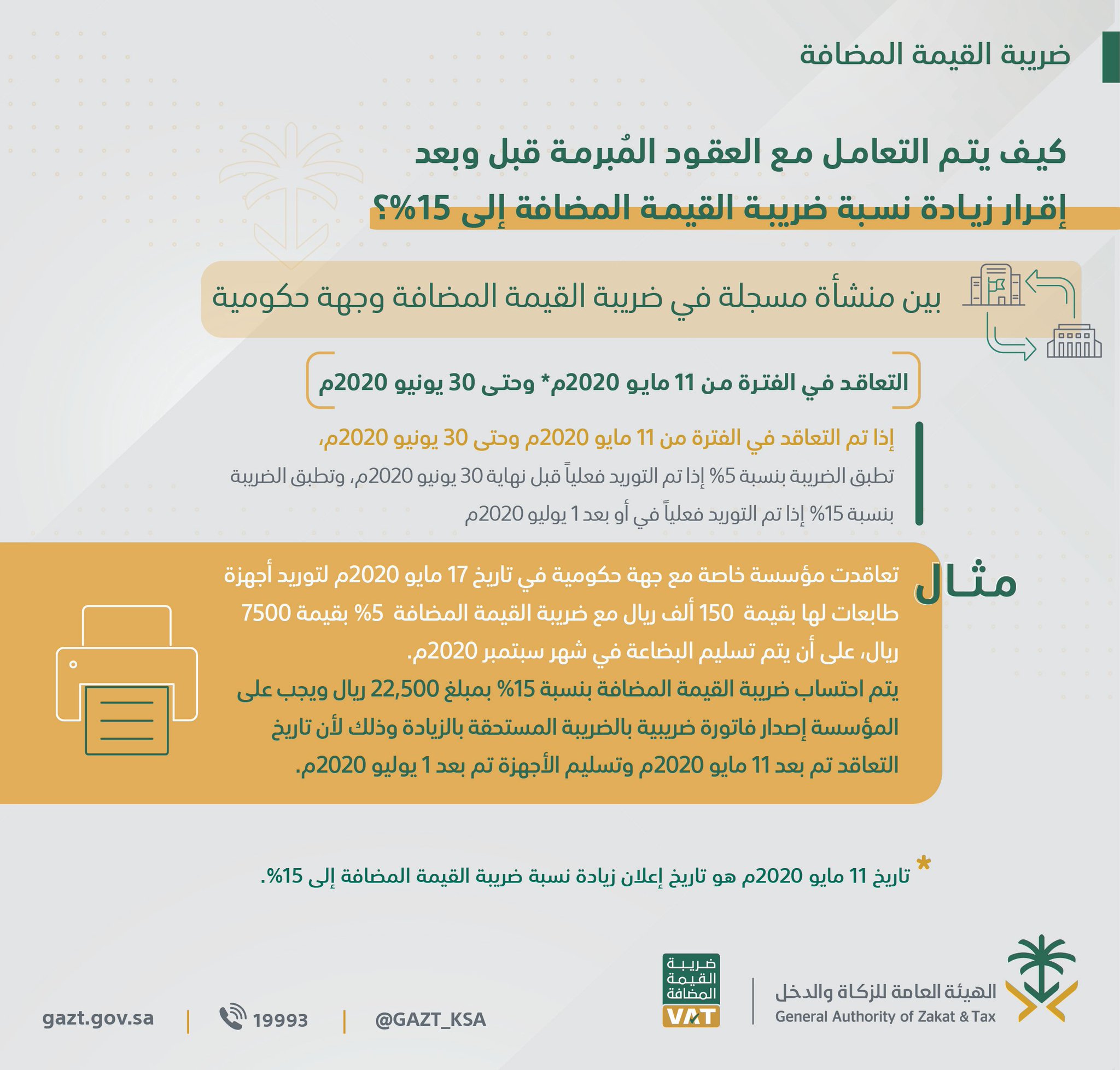 الهيئة العامة للزكاة والدخل Ar Twitter أمثلة على كيفية التعامل مع العقود المبرمة قبل وبعد إقرار زيادة نسبة ضريبة القيمة المضافة إلى 15 بين منشأة مسجلة في ضريبة القيمة المضافة وجهة حكومية Https T Co 3trhgbfvgr