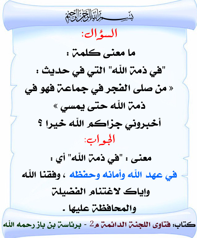 معنى من صلى الفجر في جماعة فهو في ذمة الله حتى يمسي اللجنة الدائمة بطاقات دعوية منتديات الإمام الآجري