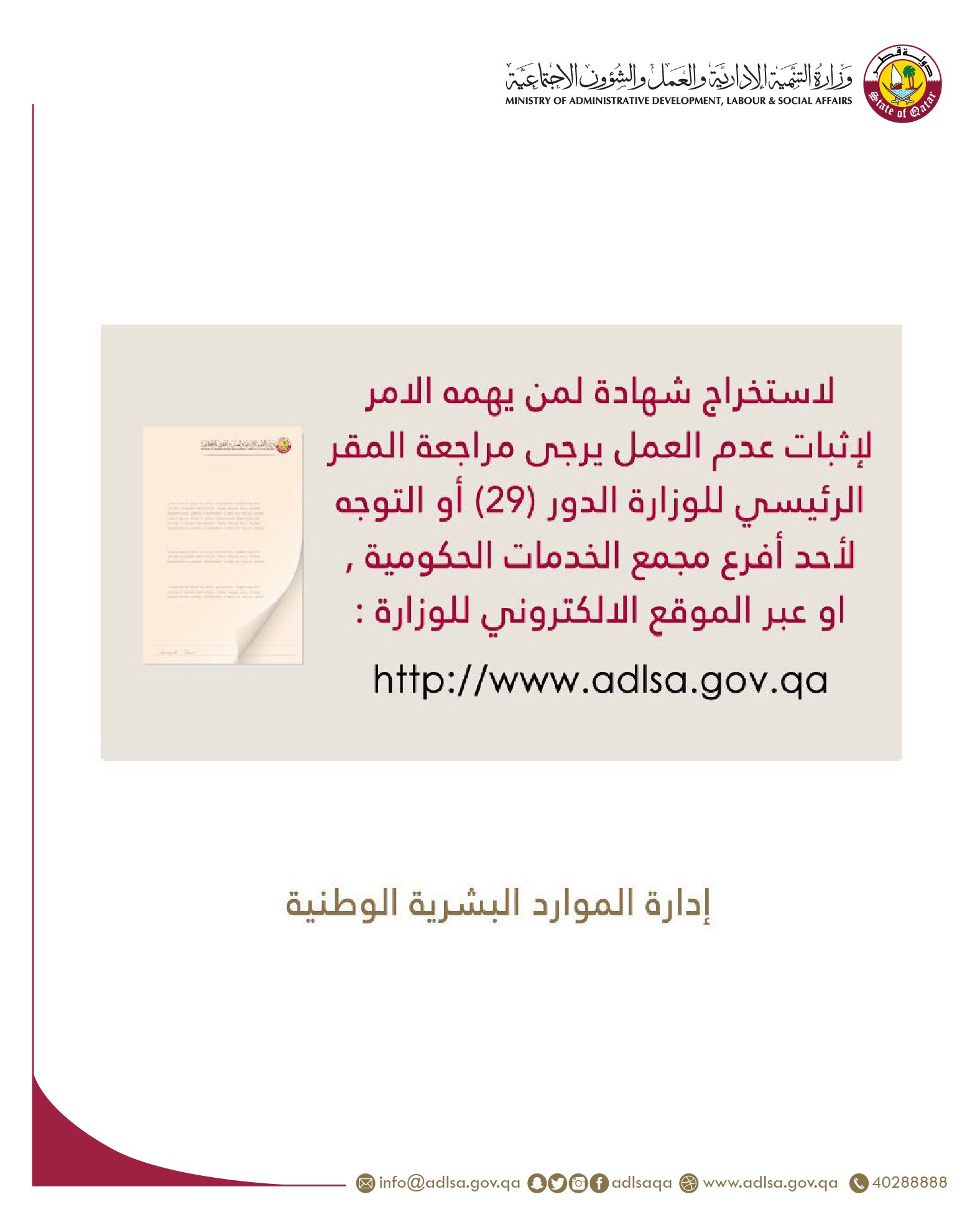 وزارة التنمية والعمل No Twitter لاستخراج شهادة لمن يهمه الامر لإثبات عدم العمل يرجى مراجعة المقر الرئيسي للوزارة أو التوجه لأحد أفرع مجمع الخدمات الحكومية أو عبر الموقع الالكتروني للوزارة Https T Co 45bd0czmdd