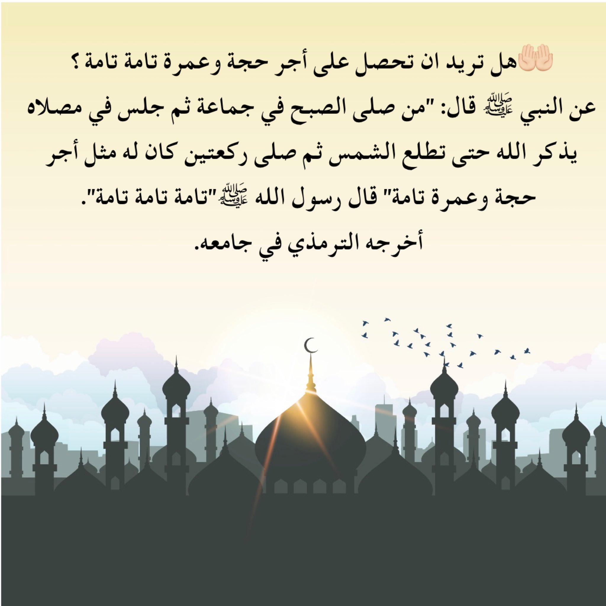 بدر الرفاعي בטוויטר هل تريد ان تحصل على أجر حجة وعمرة تامة تامة عن النبي ﷺ قال من صلى الصبح في جماعة ثم جلس في مصلاه يذكر الله حتى تطلع الشمس