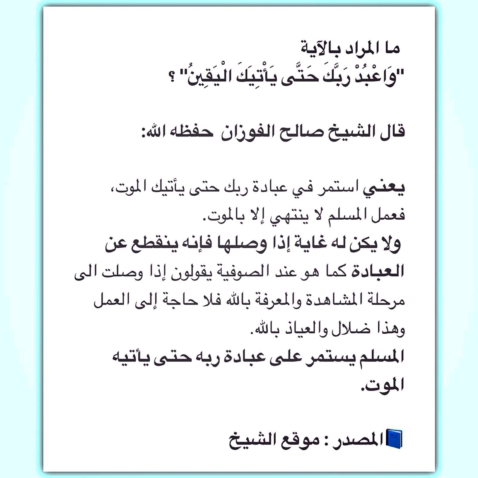العلامة صالح الفوزان On Twitter ما المراد بالآية و اع ب د ر ب ك ح ت ى ي أ ت ي ك ال ي ق ين قال الشيخ صالح الفوزان يعني استمر في عبادة ربك حتى يأتيك الموت Https T Co Pvd8qcieyq